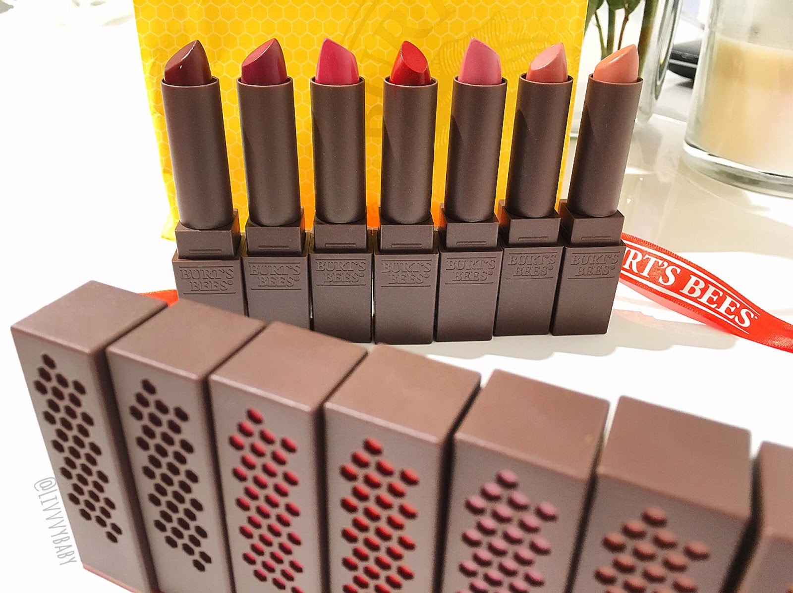 The packaging is fully recyclable and consists of 50% post-consumer recycled plastic - making these products so environmentally friendly to have. They also make great handbag essentials and the packaging is very unique. On the sides of the lipstick packaging, it actually resembles bee hives so it's quite interesting and fun to look at.